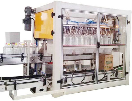 該款全自動(dòng)裝箱封箱機(jī)根據(jù)客戶包裝要求, 對產(chǎn)品進(jìn)料進(jìn)行準(zhǔn)確分道分組,同時(shí)由吸送紙板機(jī)構(gòu)將包裝用紙箱同步送至固定位置,再由氣動(dòng)部分將分組好的產(chǎn)品推進(jìn)紙箱位置,由成型折疊機(jī)構(gòu)和噴膠粘合裝置協(xié)調(diào)工作來完成產(chǎn)品的終完整紙箱包裝;各個(gè)部分的同步是由數(shù)臺伺服電機(jī)及機(jī)械調(diào)整同步來完成,以保證每組產(chǎn)品包裝的準(zhǔn)確、合格、美觀。